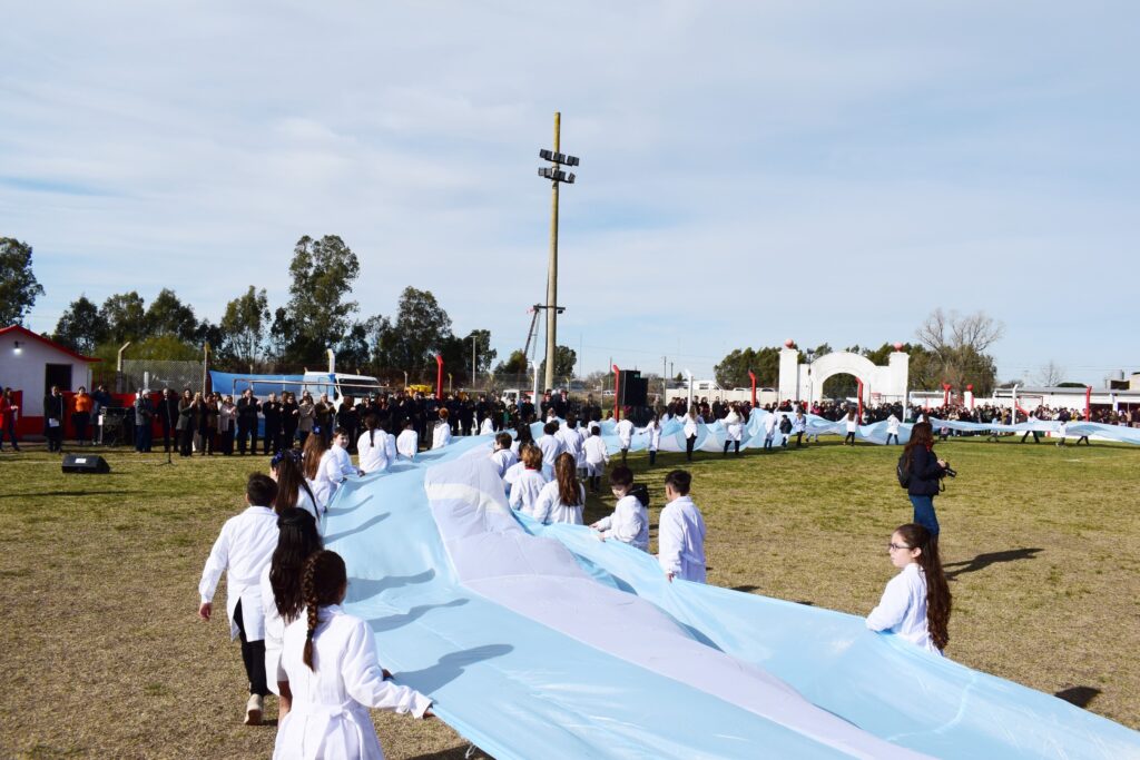 A continuación hicieron su ingreso al campo de juego las banderas de ceremonias de los establecimientos educativos, fuerzas civiles y de seguridad. Minutos después ingresaron alumnos de 4to. Año de las escuelas del distrito portando una enorme bandera nacional de más de 200 metros.