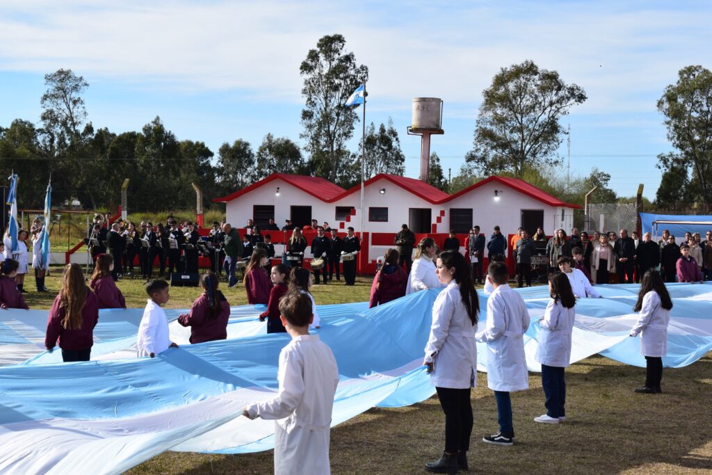 Acto seguido se entonaron las estrofas del Himno Nacional y la canción «Aurora» interpretadas por la Banda de Música municipal. La invocación litúrgica estuvo a cargo del Padre Forquera. A continuación las palabras alusivas a la fecha fueron pronunciadas por la docente e inspectora jubilada Graciela Vicente.
